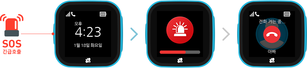 관리자(최대 4명)로 등록된 번호의 전화를 받지 않을 경우 또는 왼쪽의 SOS 버튼을 누를 경우 자동 착신됨