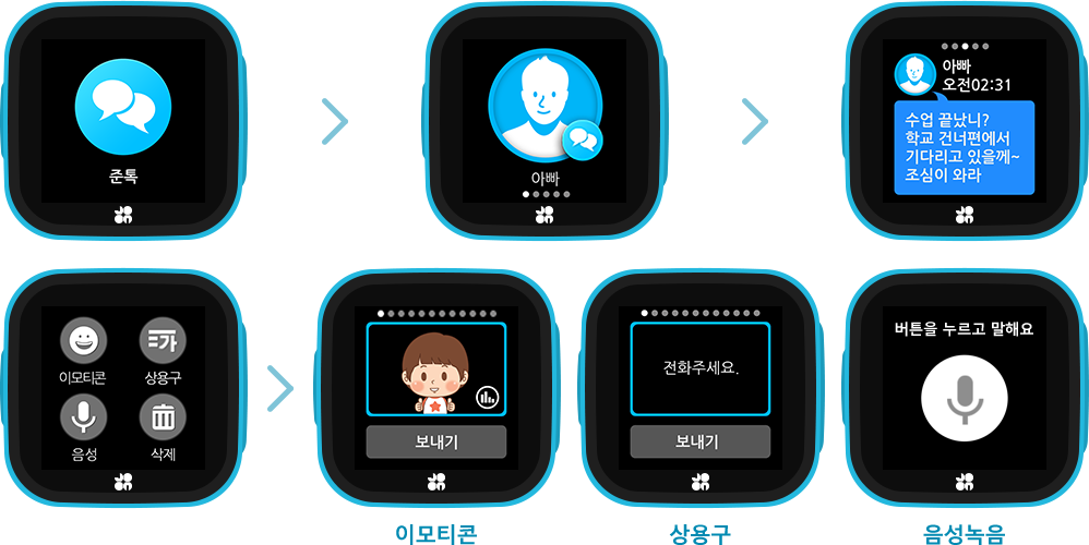 사전에 입력한 상용구로 아이가 문자 메시지를 보낼 수 있고 음성파일도 보낼 수 있습니다.