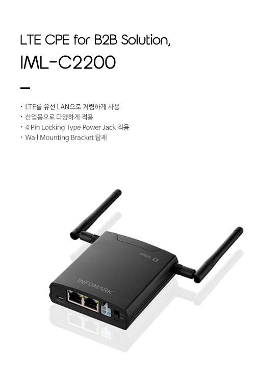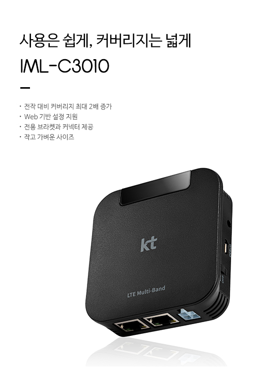 IML-C3010900MHz Rf Band 적용, 1800MHz 대비 커버리지 최대 2배 증가, 별도의 소프트웨어 없이 Web 기반 설정 지원, 전용 브라켓과 커넥터 제공, 83*83*24mm 콤팩트 사이즈, 인포마크 원격 단말 관제 솔루션 지원